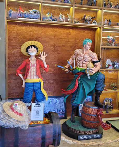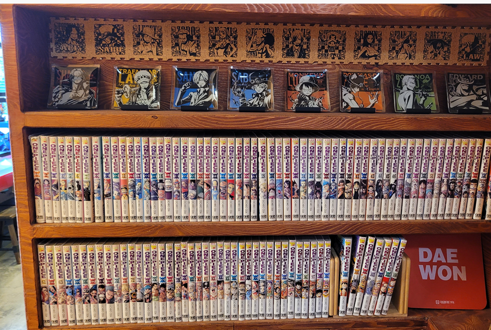 이 곳의 이름에 나왔다시피 이 곳은 단순 감귤따기 체험농장이 아니라 과수원 + 원피스 조합으로 명명되었고 입구의 카페겸 사무실엔 만화 원피스 캐릭터 피규어와 책으로 가득가득 합니다. 제가 어릴 적 좋아하던 드래곤볼 피규어도 더러 보이구요~
