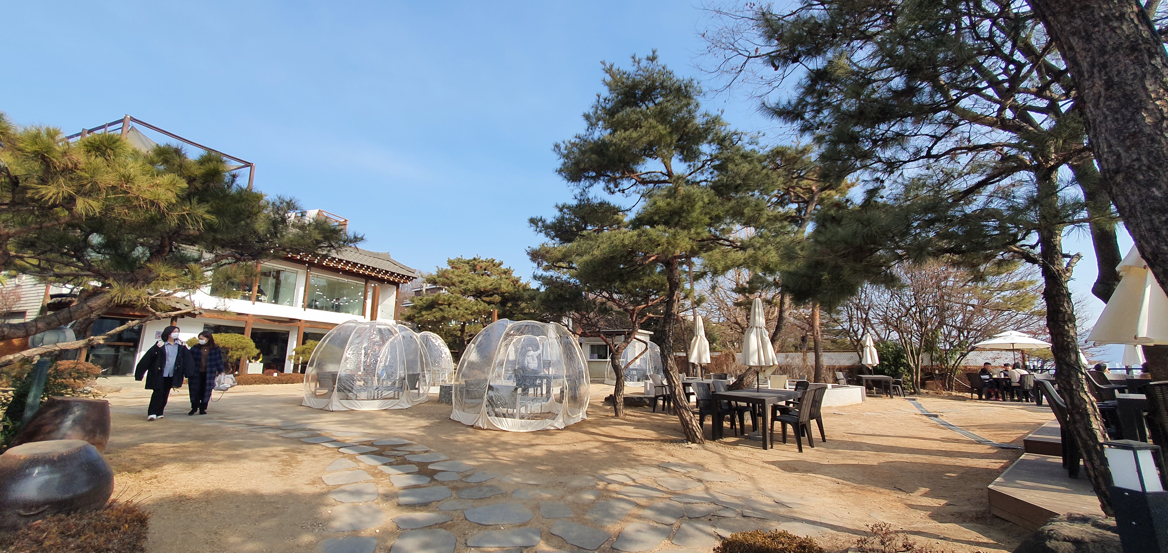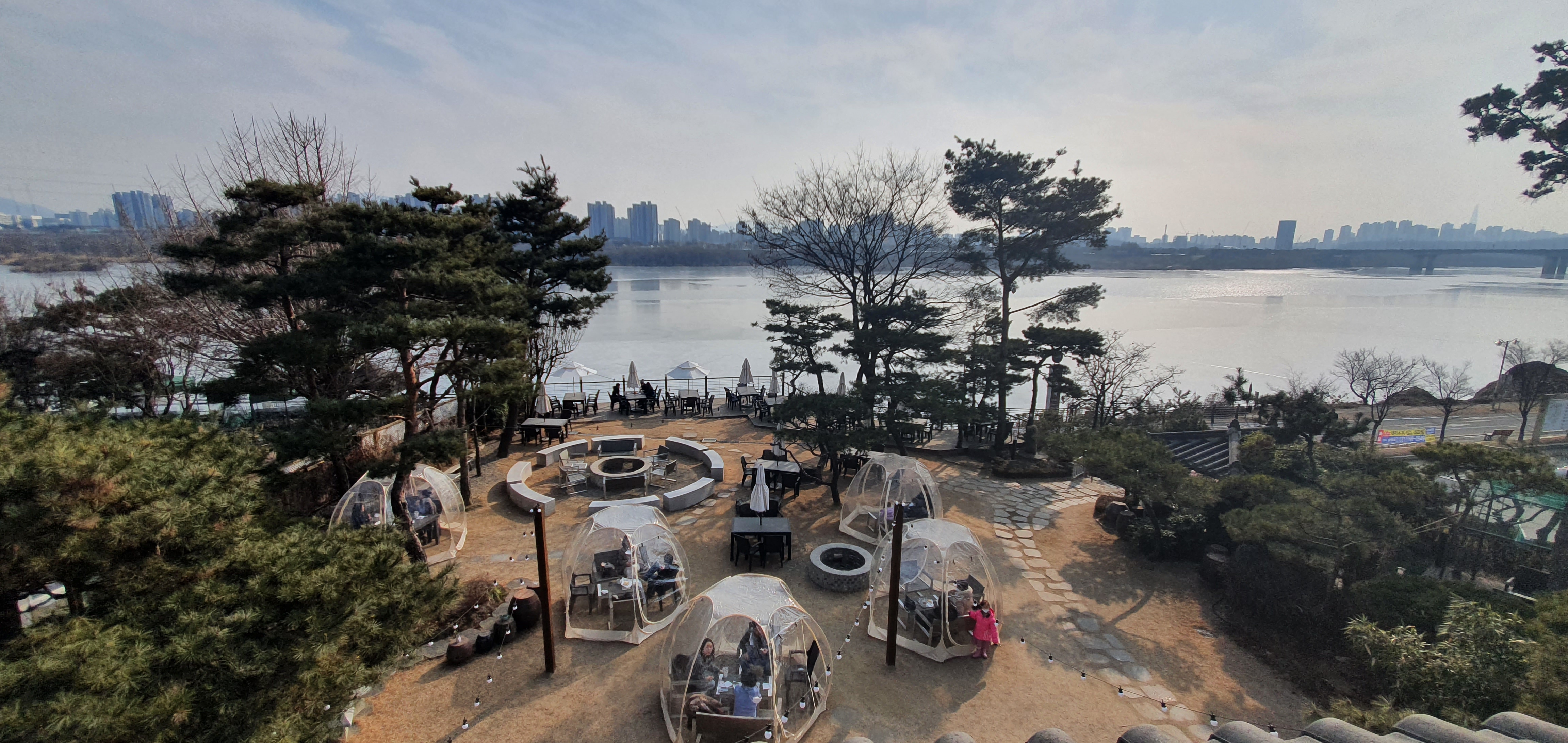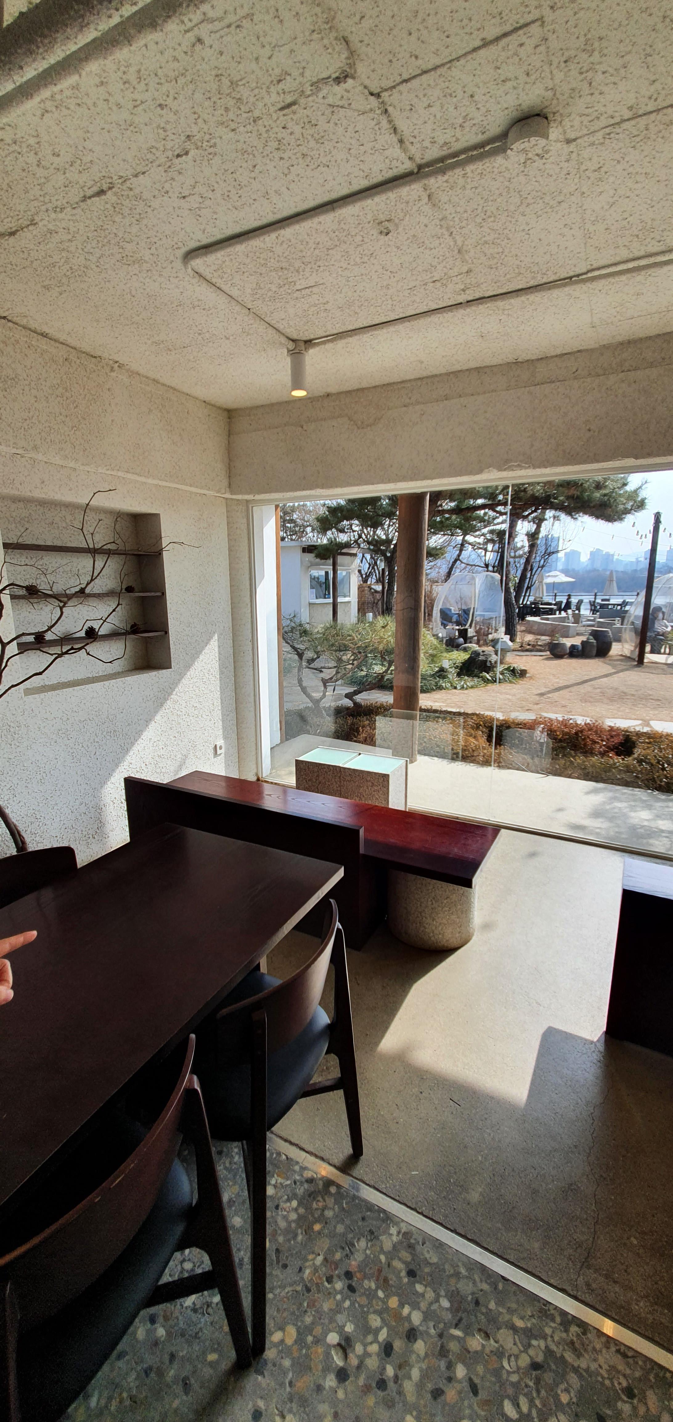2층에서는 왠지 경기도 한강뷰가 잘 보일거 같아 올라가고 싶었으나 자리도 없어보였고 또 왠걸.....2층은 노키즈 존으로 적혀있어 그냥 외부 비닐볼 테이블에 앉아 커피한잔의 여유를 즐겼다.