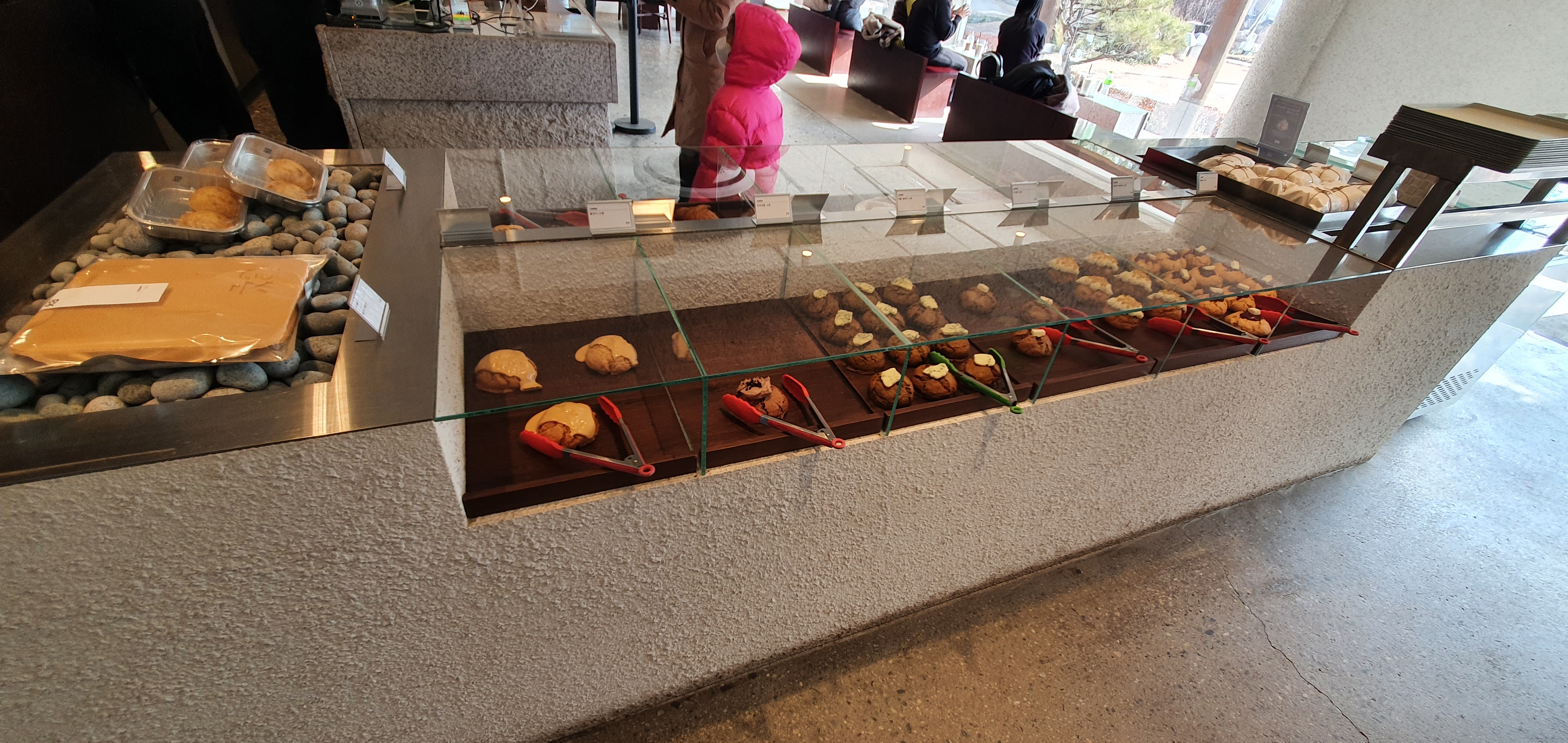 커피숍 건물 내부 1층엔 카운터와 베이커리 제품 매대, 그리고 약간의 테이블이 있으며 안쪽으로 들어가면 별실과 같은 곳에 테이블들이 마련되어 있으며, 2층도 테이블이 있으며 루프탑에도 테이블이 구비되어 있었으나 추운날씨에 루프탑엔 사람들이 올라가 구경만 하고 대부분 실내 또는 외부의 비닐볼 테이블에 착석하고 있었다.