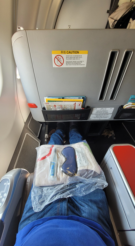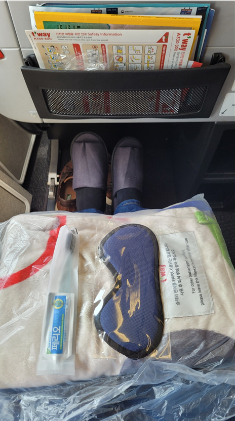 저비용항공사이지만, 비지니스 세이버 좌석은 담요, 눈가리개, 치솔세트 등 간단한 어메니티 주구요 여기엔 안보이지만 옆에 생수 작은 병도 한개 있습니다. (물은 비행기 뜨고 뭔가 거슬리기에 보니 물이 옆에 꽂혀잇더군요 ^^;;)