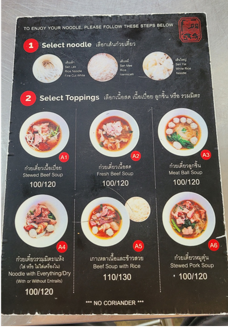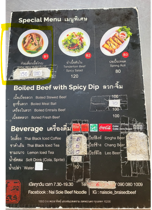 어떤게 갈비 국수인지 몰라 해매고 있는데 갈비국수를 찾는 관광객이 많은 지 저희 모습을 보더니 바로 B1 갈비국수를 알려주더라구요 150바트/ 200바트의 차이는 사이즈 입니다. 보통/곱배기 이렇게 보시면 됩니다