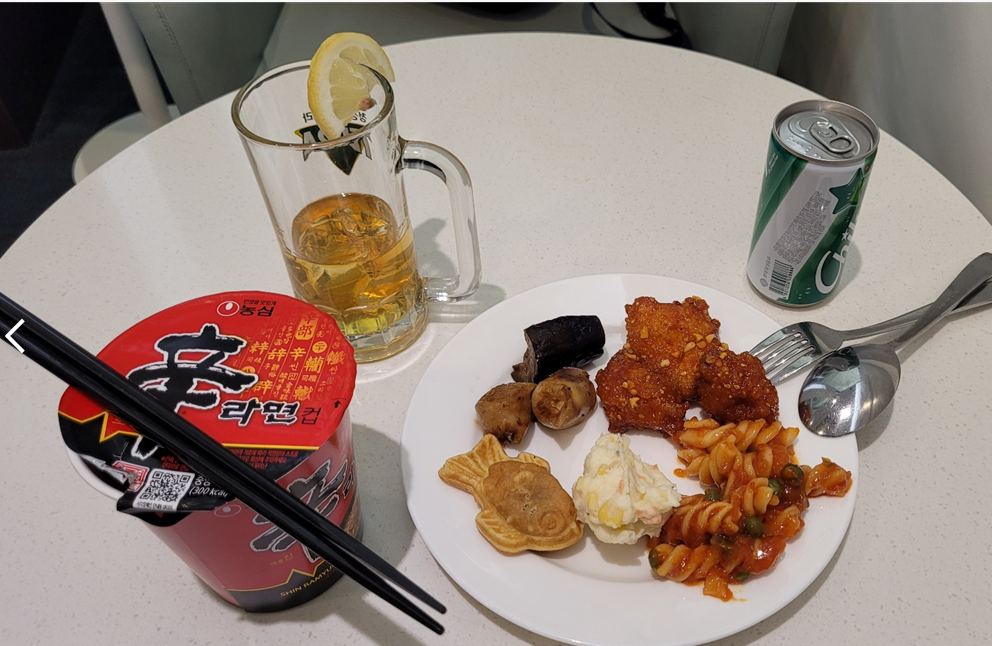 동선상 T1 탑승동에 있는 HUB Lounge를 왔습니다. 분명 소심하게 내부 사진을 찍은거 같은데.....사진이 달랑 음식 사진 하나만 남아있더군요...ㅠㅠ
